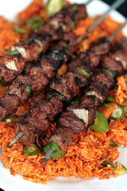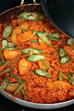 As you’ve probably guessed I’m back in Ghana. And ever since I’ve gotten here, all i want to eat is the local cuisine. Been away for too long, and had an overdose of the Desi Indian food. Knowing me n how quickly i get bored of things its not a surprise that when I’m here, i am craving Honkie food, n when in Hong Kong, i miss the Indian stuff, n when in India I’m ready to run away n get back here ! Well for now, the new thing with me is I absolutely cant stand anything sweet. I’ve just been binging on all things spicy, salty n sour ! Shocking ain’t it ? Never thought you’d hear that from me, but its true. I think the next couple of posts will be about everything that’s not sweet. Hmmm … so lets get started with today’s special. This was lunch … Joll Of Rice n Beef Kebabs. Joll of Rice is common throughout West Africa, but its origin lies in Ghana. Its a very aromatic and flavourful one pot rice meal. Its great on its own or even when accompanied with grilled meats. You can have a veggie, chicken or meat version of it. For the benefit of my vegetarian friend I’ve made a veggie one today, but to make it non veg, just add strips or tiny cubes of your favourite meat in there.