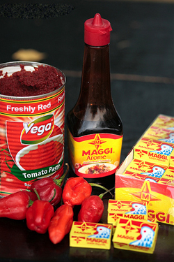 The quintessential ingredients to most of the Ghanaian cooking are Maggie cubes, rich tomato paste, scotch bonnet chillies and Maggie Arome seasoning. You have these and you know your dish is winner.