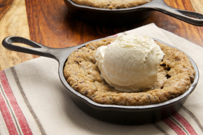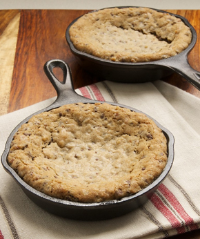 While you can certainly bake this cookie dough in a large skillet, I opted to use my mini 5-inch Lodge skillets to make smaller cookies. I can’t help it. I’m a sucker for mini desserts! Each of these will serve two, so divvy it up before serving, or grab a friend and a couple of forks and just dig in.